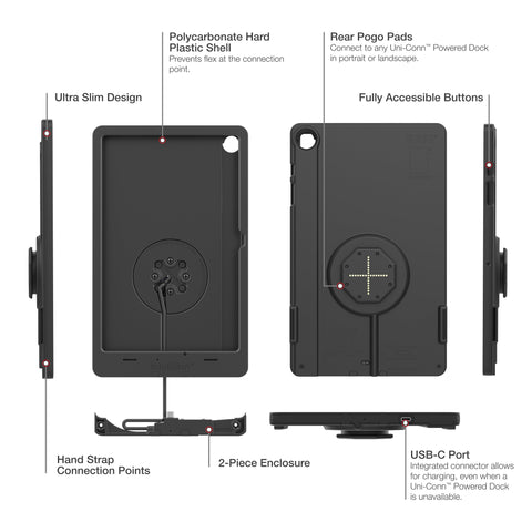 The IntelliSkin Thin-Case for Samsung A9+ with Rear Pogo Pads (RAM-GDS-SKIN-SAM88-TCB) is a low-profile, two-piece device enclosure designed for the GDS Uni-Conn docking platform. The GDS connection style integrates a USB-C connector that routes through the case to the pogo pads integrated into the GDS Uni-Conn adapter. The robust polycarbonate shell protects your device from daily wear and tear while the complete enclosure makes it difficult for unauthorized users to access the tablet, providing additional peace of mind for tablets mounted in high-traffic environments. The flat, ruggedized pogo pad contacts are made for repetitive docking to protect the device's port and collect less dirt making them easier to clean. An integrated USB Type-C connector at the bottom of the case allows for device charging even when you dont have a GDS Powered Uni-Conn Dock available. The IntelliSkin Thin-Case for the Samsung A9+ is only compatible with GDS Powered Uni-Conn docks, easily identified by the GDS Powered Uni-Conn Adapter emblem. One Dock to Connect Them All. Always Protected. Always Connected.