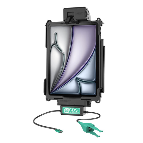 The Locking GDS Tough-Dock + USB-C & USB-A for iPad 10th & 11th Gen, Air 5 & Pro 11" (RAM-GDS-DOCK-AP32C-CAU) is a vehicle dock designed to support the Apple iPad Air (4th & 5th Gen) & iPad Pro 11" (1st - 4th Gen) in an IntelliSkin Next Gen protective sleeve, ideal for fleet deployment. Using a USB Type-C power connector, the GDS Tough-Dock supports data syncing and charging capabilities for the Apple iPad Air (4th & 5th Gen) & iPad Pro 11" (1st - 4th Gen). Connect up to two input devices with the dual USB-A and USB-C connector, ideal for keyboards, mouse, printers, and more. The GDS Tough-Dock is compatible with RAM ball and socket systems using the integrated 4-hole AMPS hole pattern. The GDS Tough-Dock is backed by a 3-year warranty. This dock will keep your iPad charged with any Power Delivery charging source (see Complete Your Solution tab). Always Protected. Always Connected.